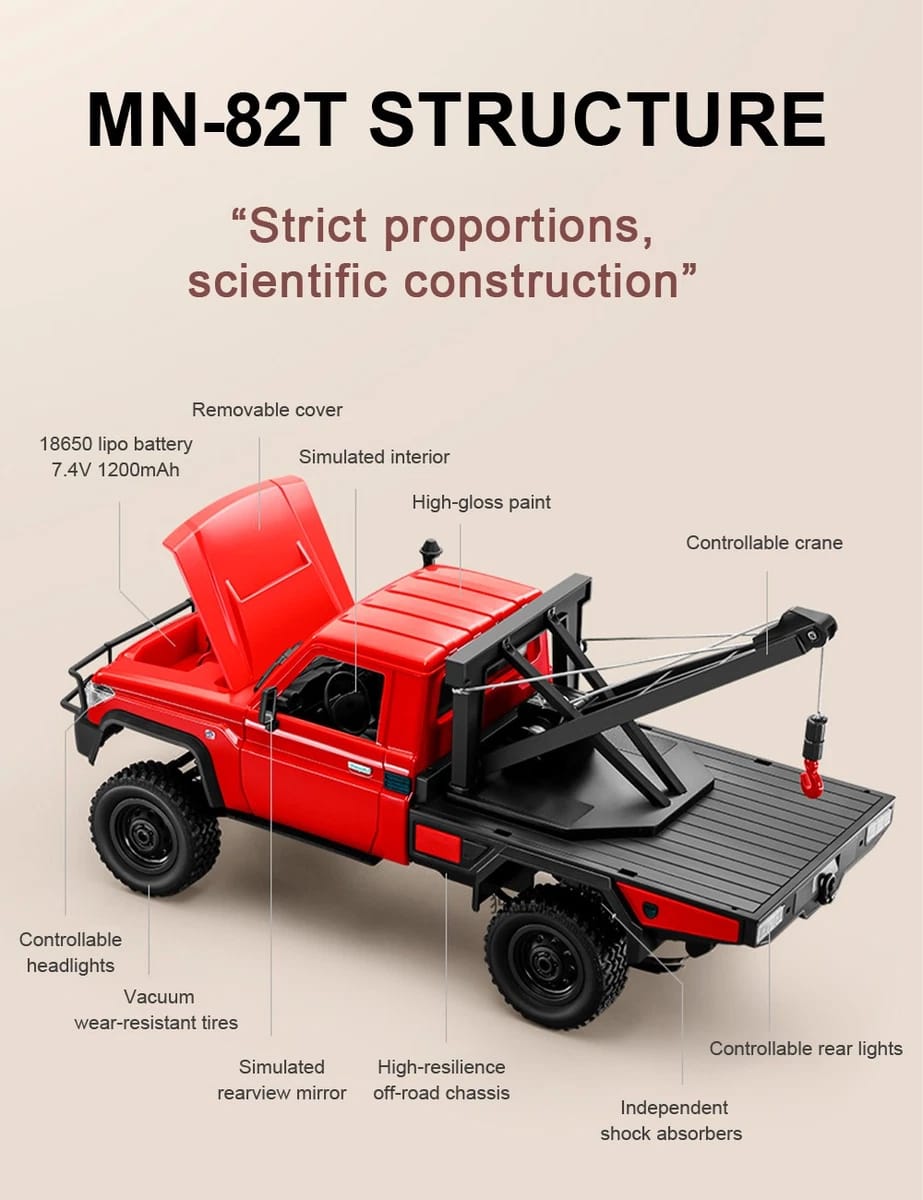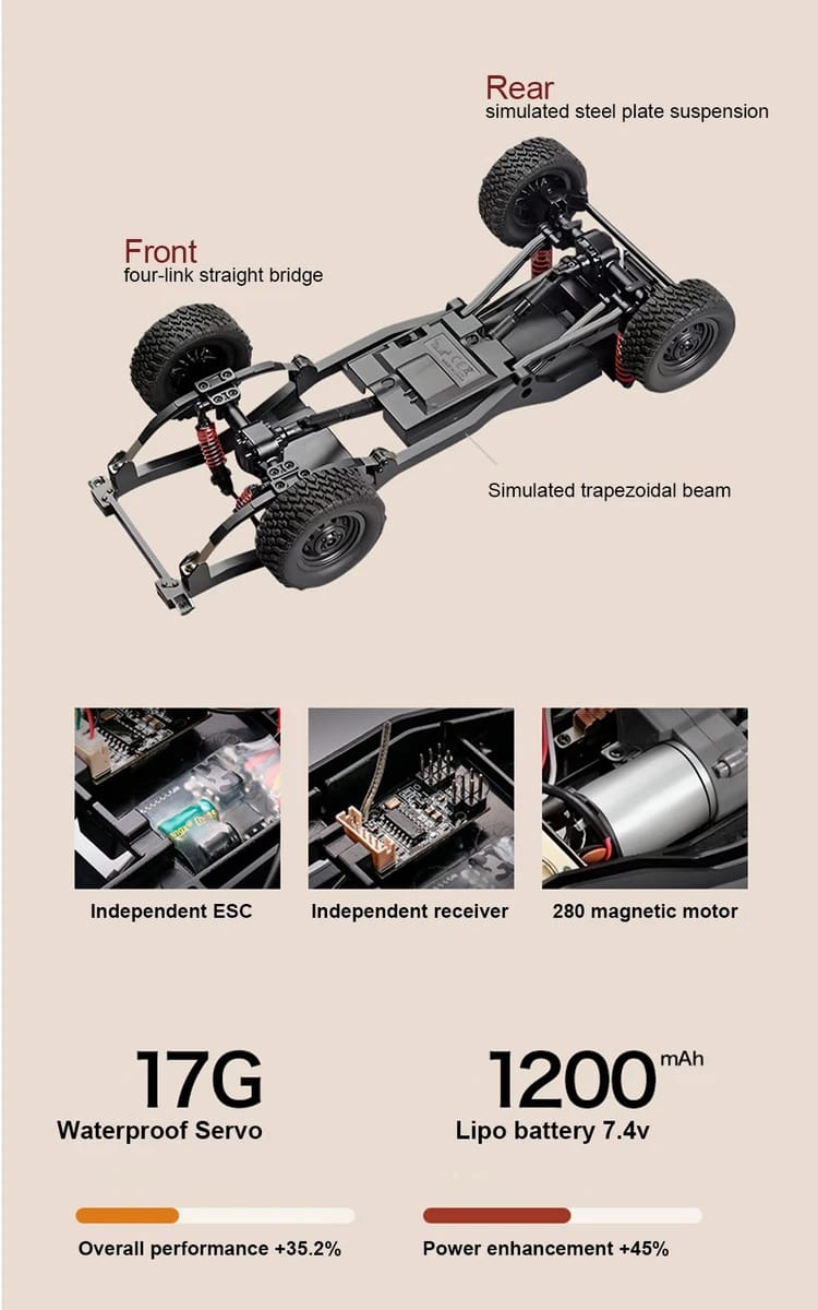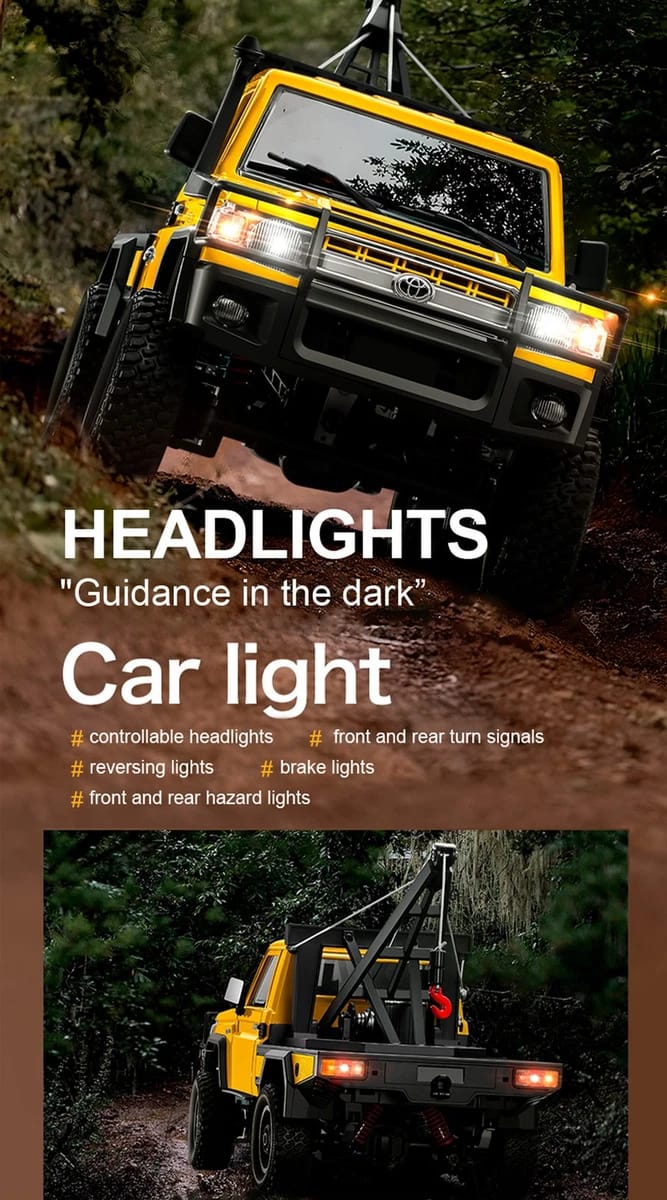 Forward, backward, left turn, right turn, proportional remote control, two-stage speed change, remote control for headlights